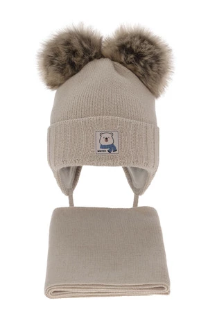 Komplet zimní chlapecký: čepice a šála béžový s dvěma bambulemi Jewel