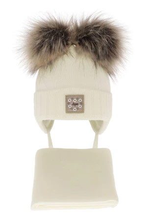 Komplet zimní dívčí: čepice a šála krémový se dvěma bambulemi Jazz