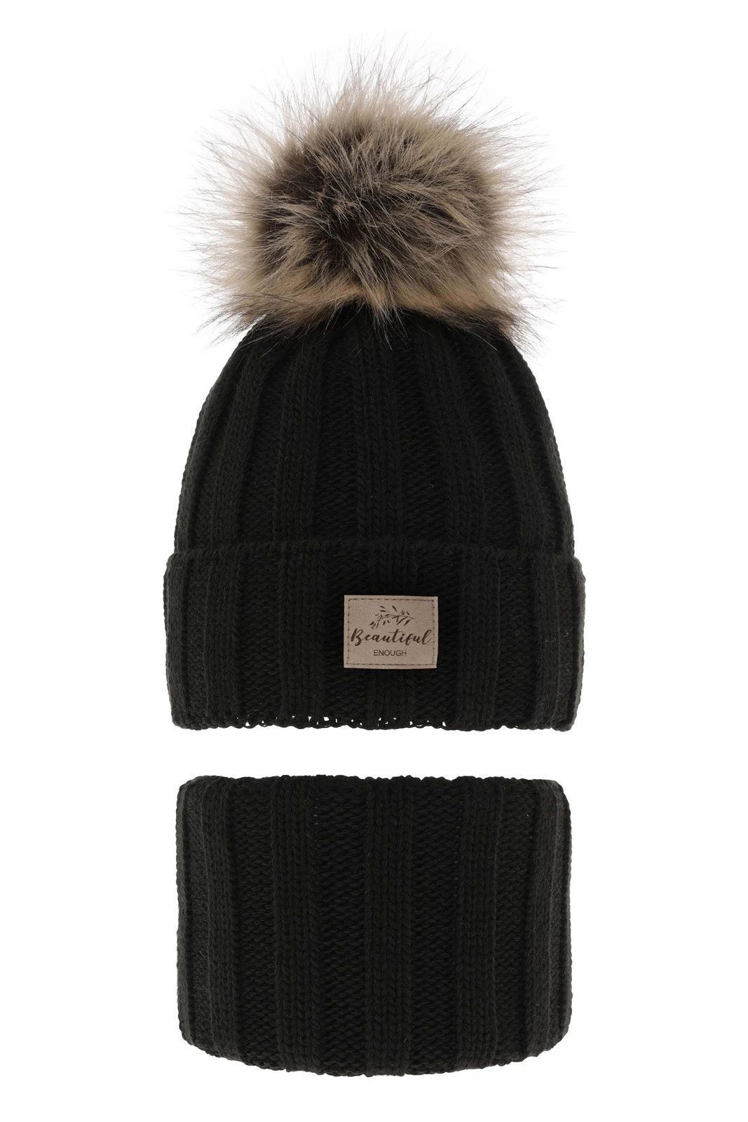 Komplet zimní dívčí: čepice a tunel černý s bambulí Kaliope