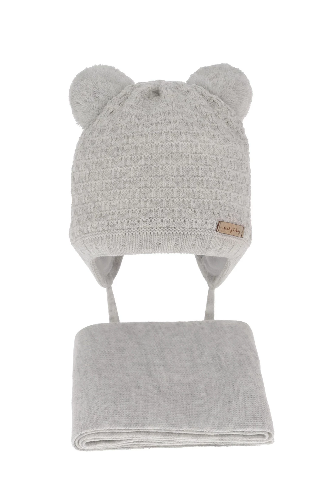 Komplet zimný chlapčenský: čiapka a šál šedý s dvoma bambuľami Franki