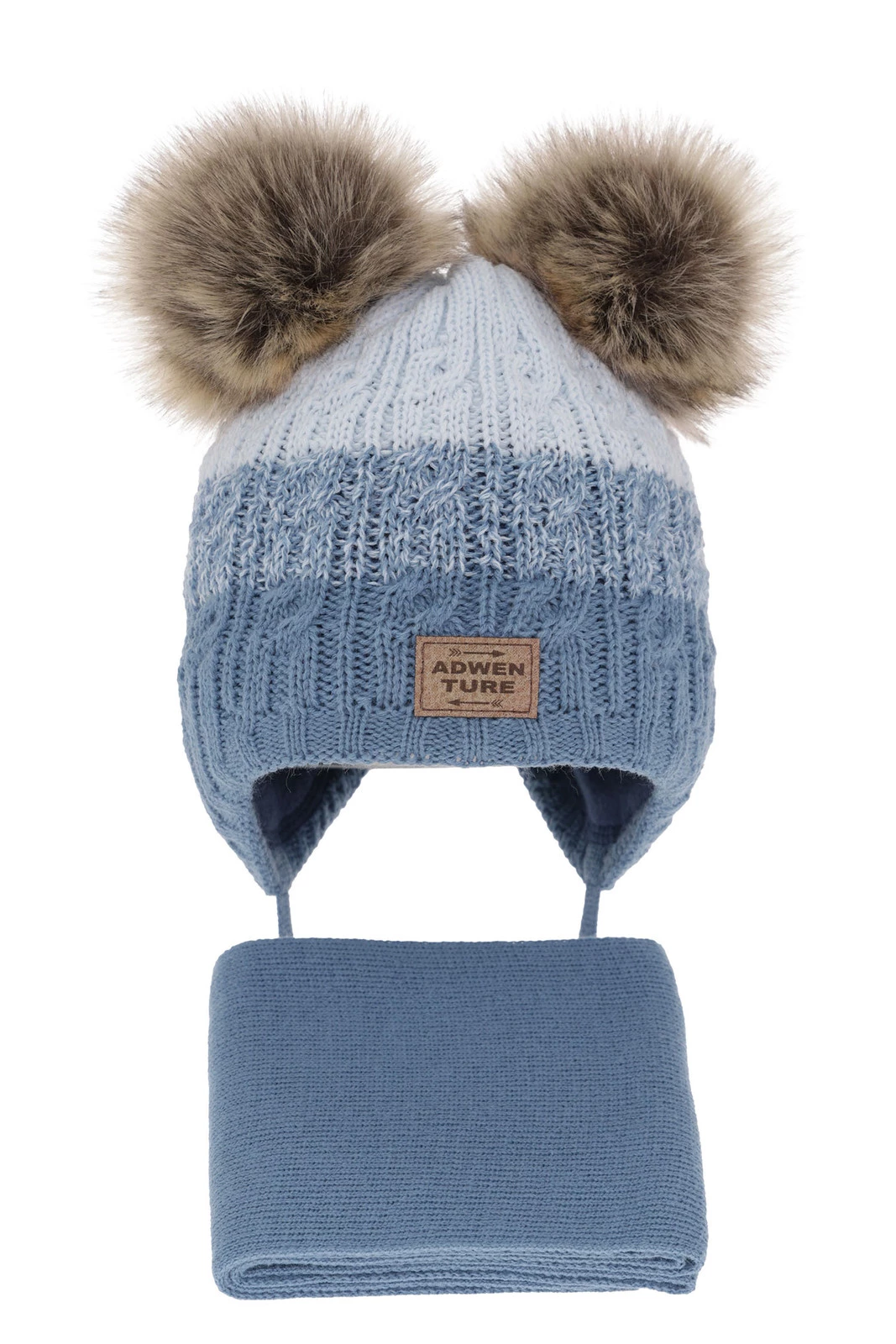 Komplet zimný chlapčenský: čiapka a šál modrý s dvoma bambuľami Platon