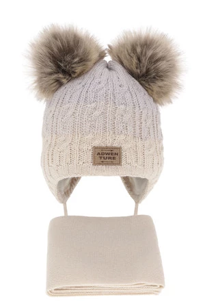 Komplet zimný chlapčenský: čiapka a šál béžový s dvoma bambuľami Platon