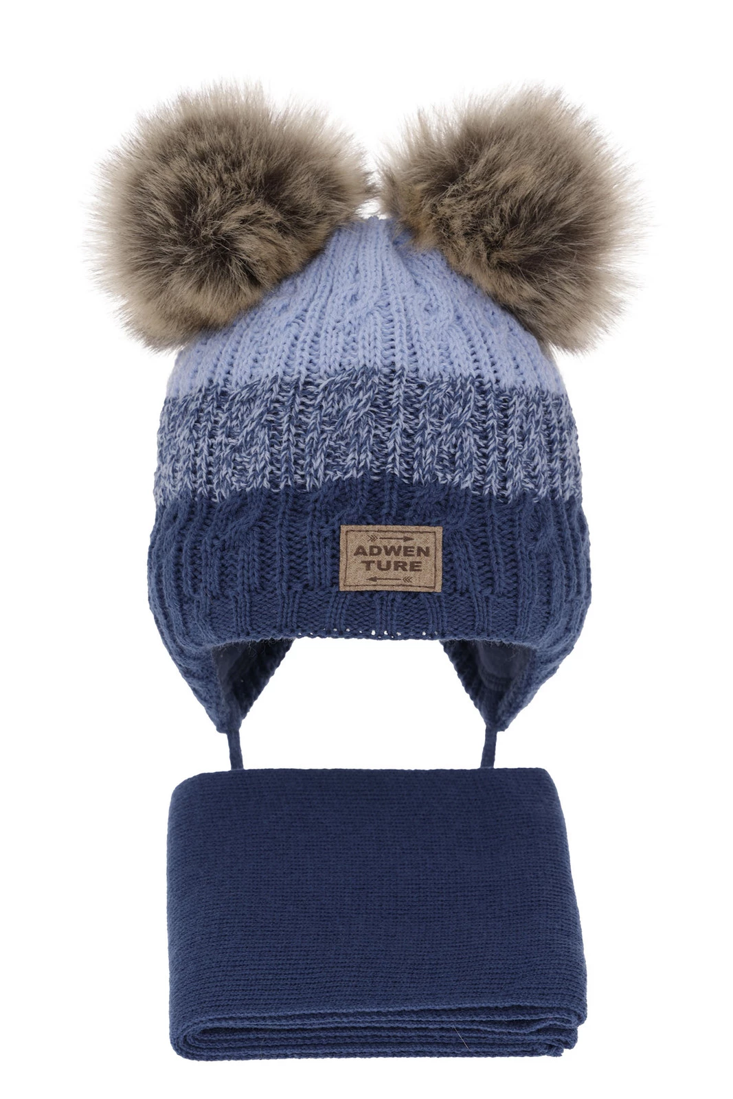 Komplet zimný chlapčenský: čiapka a šál modrý s dvoma bambuľami Platon