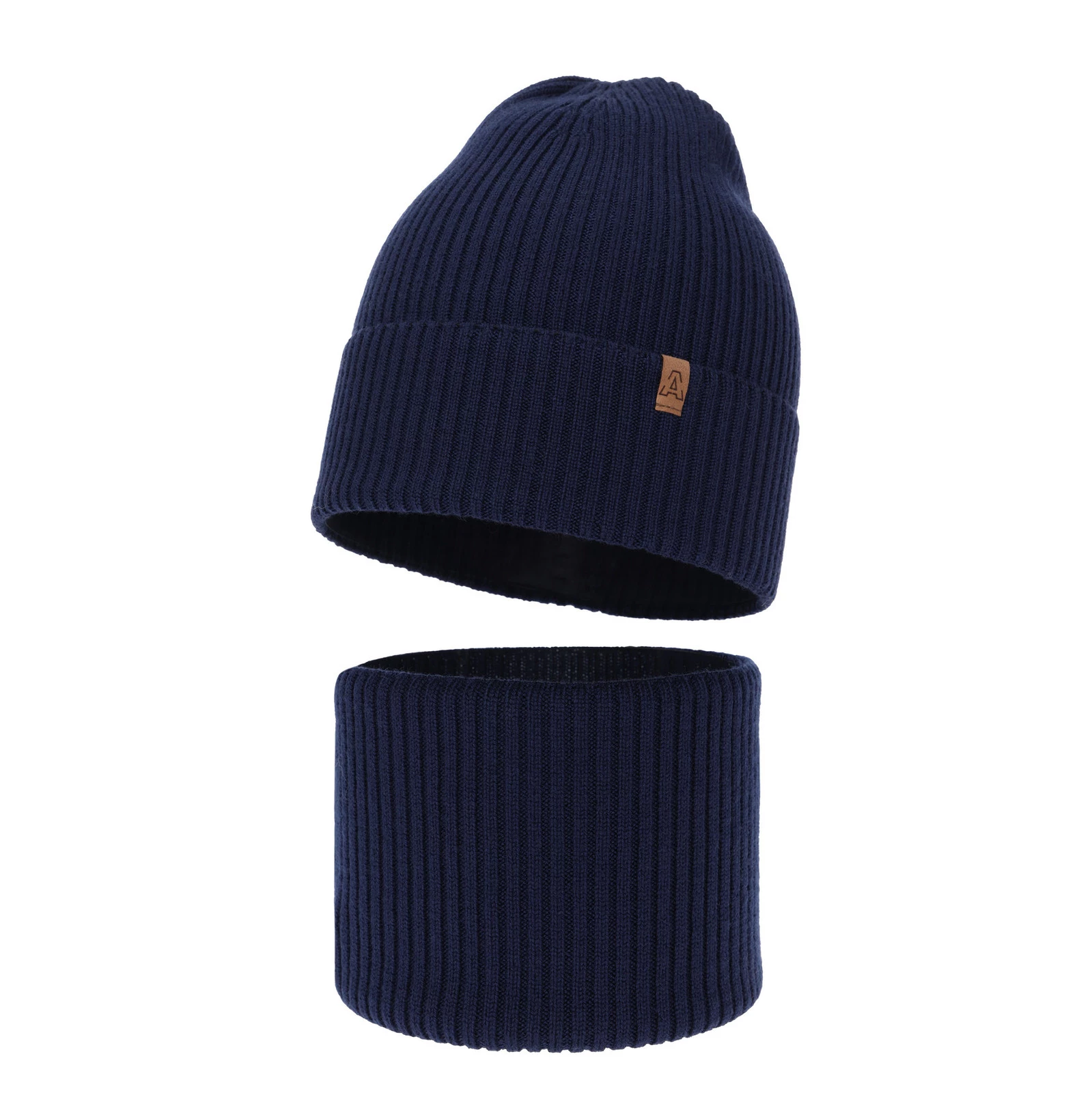 Komplet podzimní/jarní chlapecký: čepice a tunel tmavě modrý 100% extrafine merino vlna Lemas