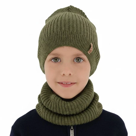 Komplet podzimní/jarní chlapecký: čepice a tunel khaki 100% extrafine merino vlna Chester