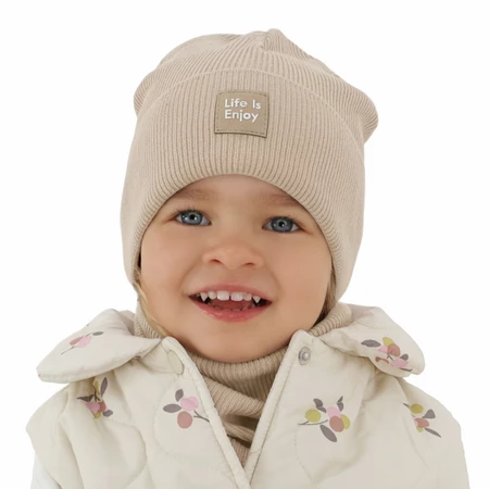 Jarní komplet zaujme módním žebrovým úpletem a elegantní ozdobnou aplikací na čepici. Tento detail dodává celému kompletu výjimečný vzhled a činí jej nepostradatelným doplňkem dívčího šatníku. Tunnel bez podšívky je praktický a snadno se nosí, zatímco čepice dokonale chrání před chladem a větrem.