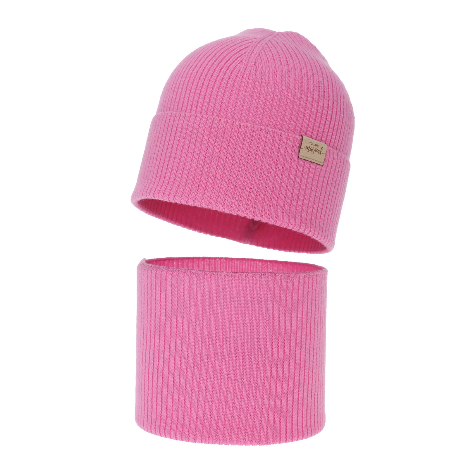 Komplet podzimní, jarní dívčí: čepice a tunel, růžový, 100% merino vlněná, Magenta