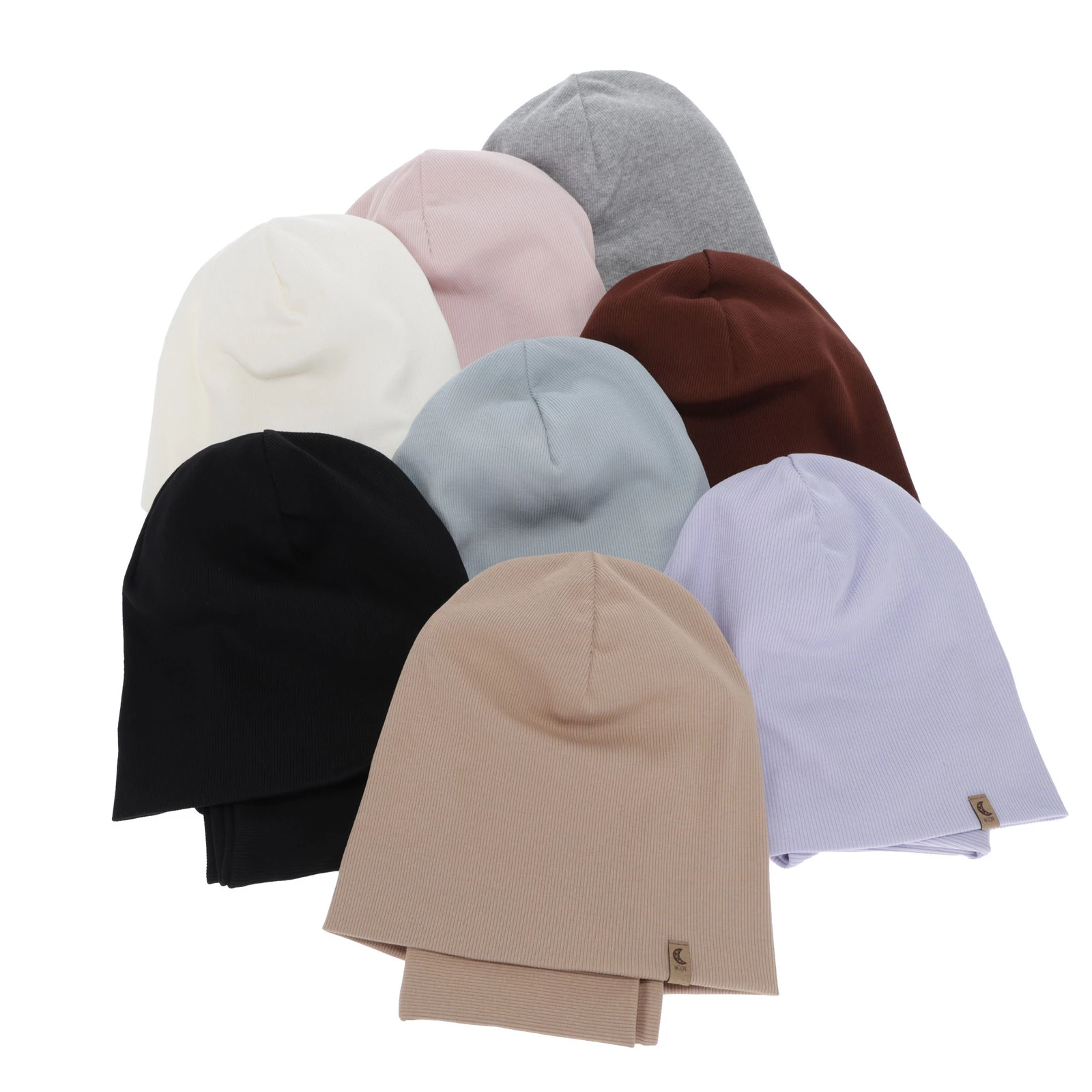 Materiál z bavlněné směsi zajišťuje vynikající vlastnosti pro každodenní nošení. Bavlna poskytuje příjemnou měkkost a prodyšnost, zatímco přidaný moderní materiál zvyšuje elasticitu a odolnost produktu. Tato kombinace zaručuje, že se komplet čepice a tunel perfektně přizpůsobí hlavě vašeho dítěte a vydrží dlouhodobé používání bez ztráty tvaru.