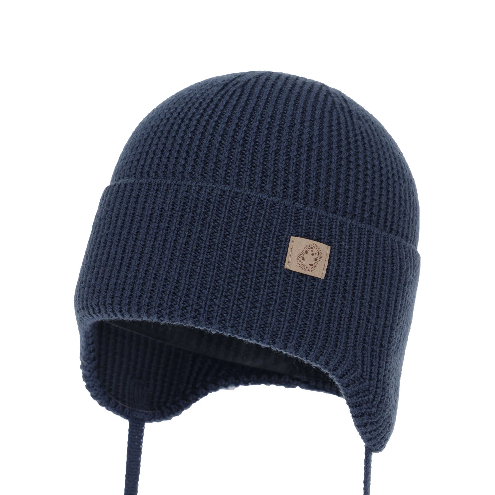Chlapecká zimní, podzimní, jarní čepice, 100% merino vlněná, zavazovací, tmavě modrá, Bakadi